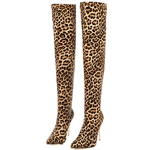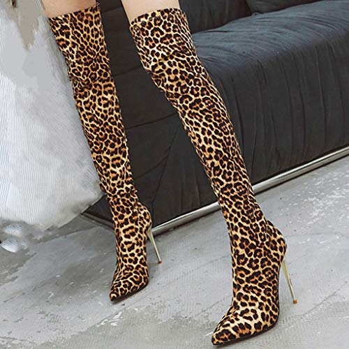LOVOUO Donna Stivali Sopra al Ginocchio Elasticizzati Tacco a Spillo Alto Boots Senza Cerniera (34 EU,Leopardate)