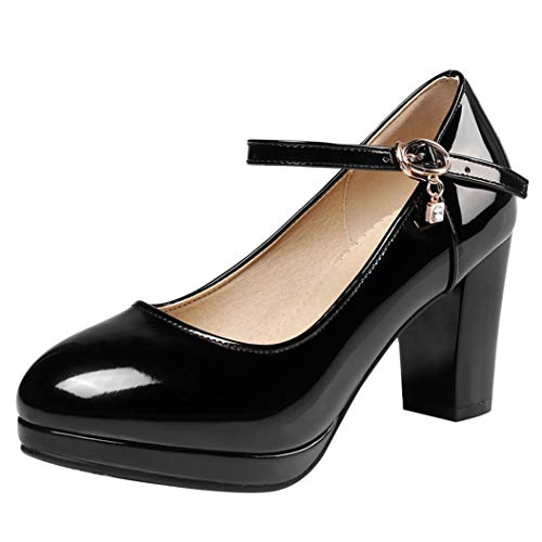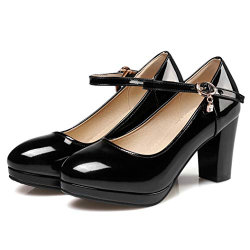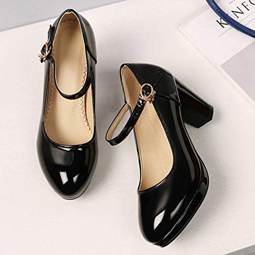 LOVOUO Mary Jane in Vernice Decolte Donna con Tacco a Blocco Cinturino alla Caviglia High Heels Pumps (39 EU, Nero)