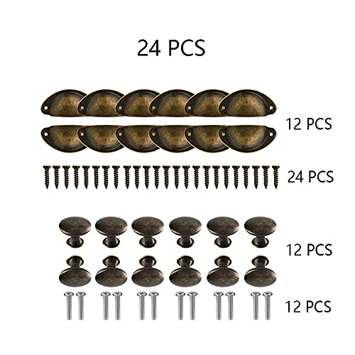 Set di maniglie vintage: il set contiene due diversi stili di maniglie, ovvero una maniglia a forma di conchiglia in bronzo antico e una manopola in bronzo antico, ciascuna con 12 pezzi. La maniglia è dotata di un totale di 24 viti e la manopola è dotata di un totale di 12 viti.