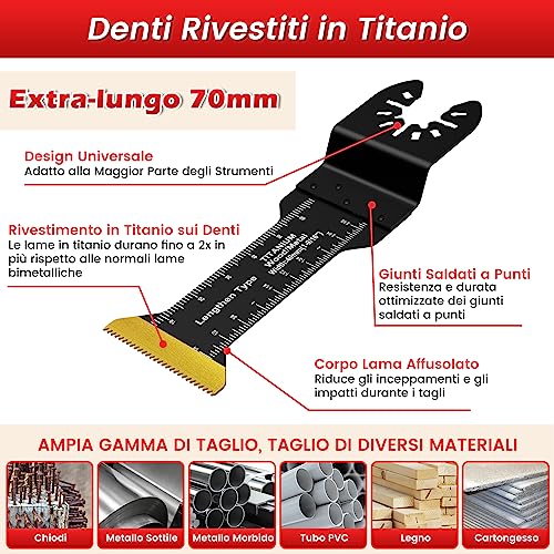 【Taglio ad alta efficienza】: La nostra lame per utensili oscillanti in titanio è più resistente al taglio rispetto alle normali lame per seghe, evitando frequenti sostituzioni della lama durante il lavoro e migliorando l'efficienza del lavoro. E le nostre lame utensile multifunzione in metallo / legno Extra Lunghe / Estese forniscono agli utenti marcatori di lunghezza millimetri / pollici per determinare la profondità di taglio