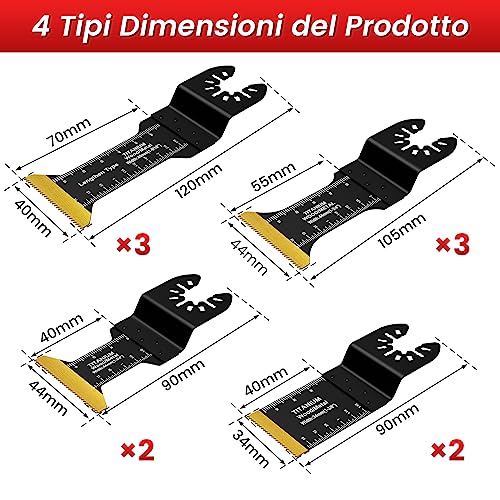 【4 Tipi 10 Pezzi】: Il kit lame multifunzione in titanio include: 3 pezzi Extra Lunga 40 mm (1-9/16''), 3 pezzi Estese 44 mm (1-3/4''), 2 pezzi 44 mm (1-3/4'') e 2 pezzi 34 mm (1-3/8''). Vari tipi di lame multiutensile oscillanti in titanio possono soddisfare le diverse esigenze di taglio