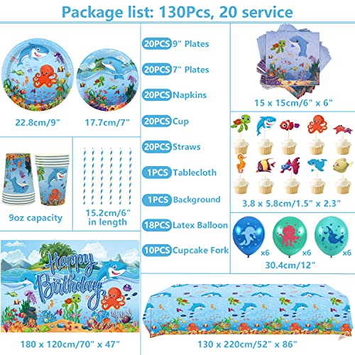 LSJDEER Forniture per feste sotto il mare - Piatti, tazze, tovaglioli, tovaglie, fondale, palloncini, decorazioni per feste di compleanno nel mondo sottomarino, per 20 persone