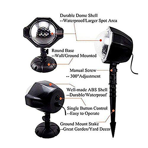 【ECHT SNEEUWVAL EFFECT】 Met een verscheidenheid aan roterende witte stippen wekt de projector de illusie van echte sneeuw, de roterende sneeuwvlokontwerpen hebben een groot detectioniegebied (15-50㎡ / 18-60 sq.yd) op het beste afstandspunt (3 -6 m ), vooral op bruiloften, met kerst en op andere feetdagen of jubilea. Het is gemakkelijk om romantic buren te creëren.