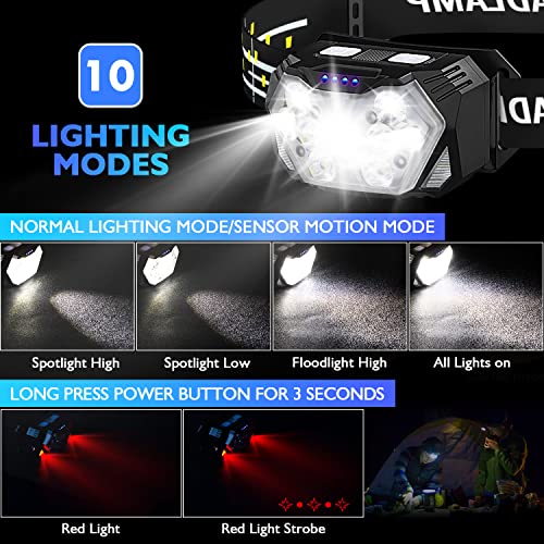 Lsnisni Torcia da Testa 9 Led 1 Pezzi, 2000 Lumens Lampada Frontale USB C Ricaricabile, 6 Modalità Luce Bianca e Rossa, Con Sensore di Movimento, IP×5 Impermeabile, per Campeggio, Corsa, Pesca