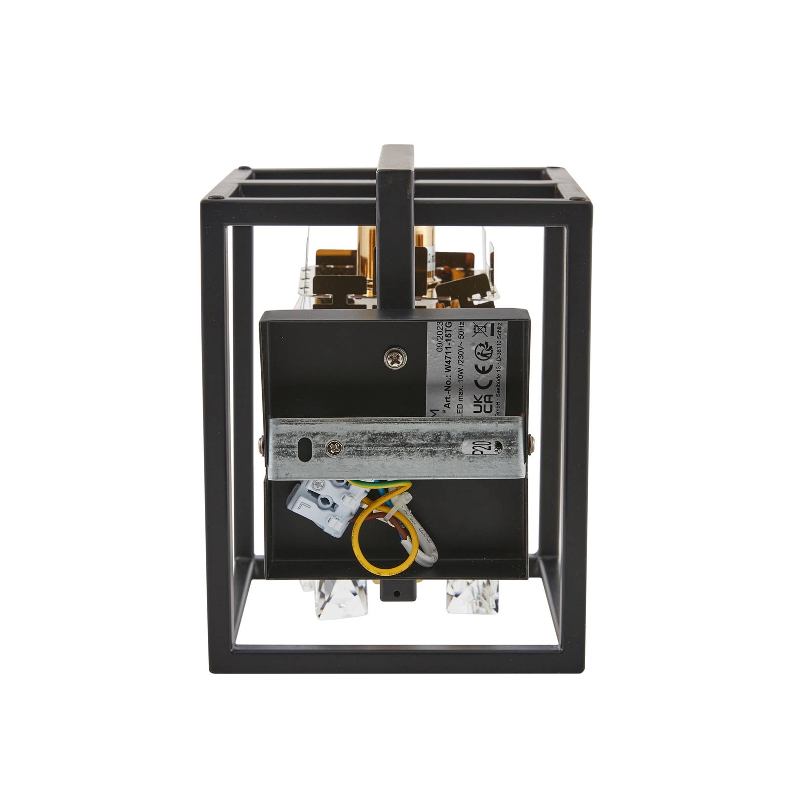 Applique Arcan con design aperto ed elementi in vetro cristallo L'applique Arcan è costituita da una cornice nera con un design aperto che permette di vedere l'interno dell'apparecchio. Sono presenti piccole placche ed elementi decorativi in cristallo. Questi elementi rendono l'applique un'attrazione speciale nella zona giorno, anche quando è spenta. Arcan può essere utilizzata come fonte di luce, ad esempio, in soggiorno, nel corridoio o in camera da letto. Nella struttura è integrato un portalampada per una lampadina E14.
