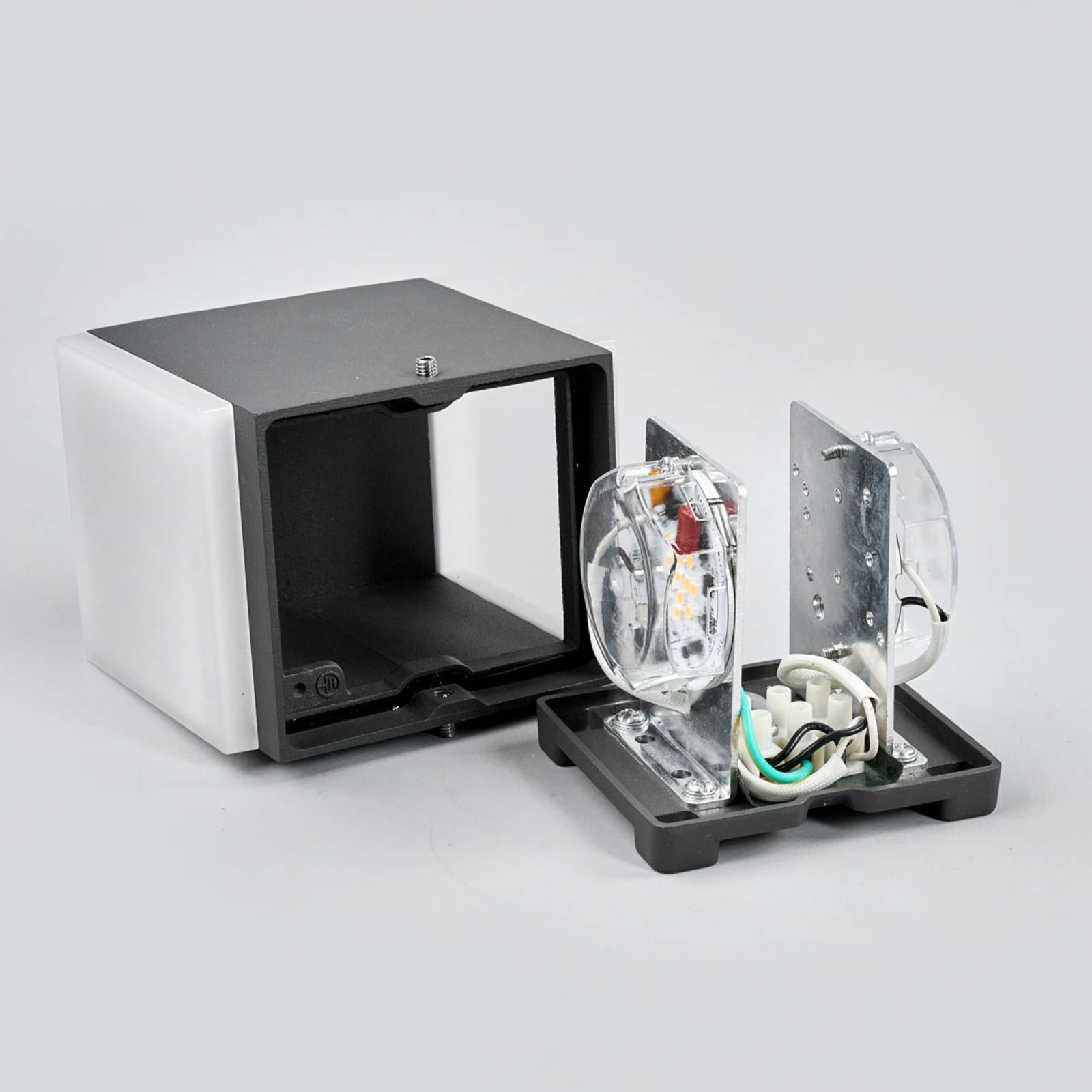 Essenziale applique LED da esterni Sarah in finitura grigio scuro L'applique LED da esterni Sarah è formata da un compatto elemento in pressofusione di alluminio, cui si aggiungono due rifrattori di plastica che coprono le sorgenti luminose. L'illuminazione emessa risulta omogenea e viene percepita come molto gradevole. La tecnologia LED integrata garantisce un'illuminazione all'insegna del risparmio energetico.