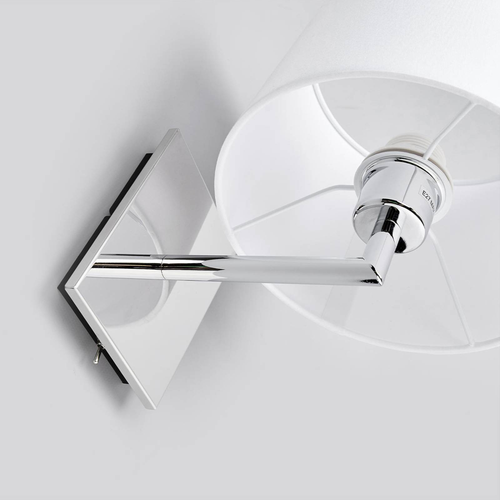 Applique bianca Randy con interruttore e paralume in tessuto cilindrico Per la sua luce resa calda e gradevole dal paralume in tessuto bianco, Randy è una lampada adatta a diversi ambienti. Nella struttura angolare cromata lucida di questa applique è integrato un interruttore che consente di accendere e spegnere la luce comodamente, senza bisogno di alzarsi dal letto o dal divano. Una lampada adatta anche per i settori gastronomico e alberghiero.