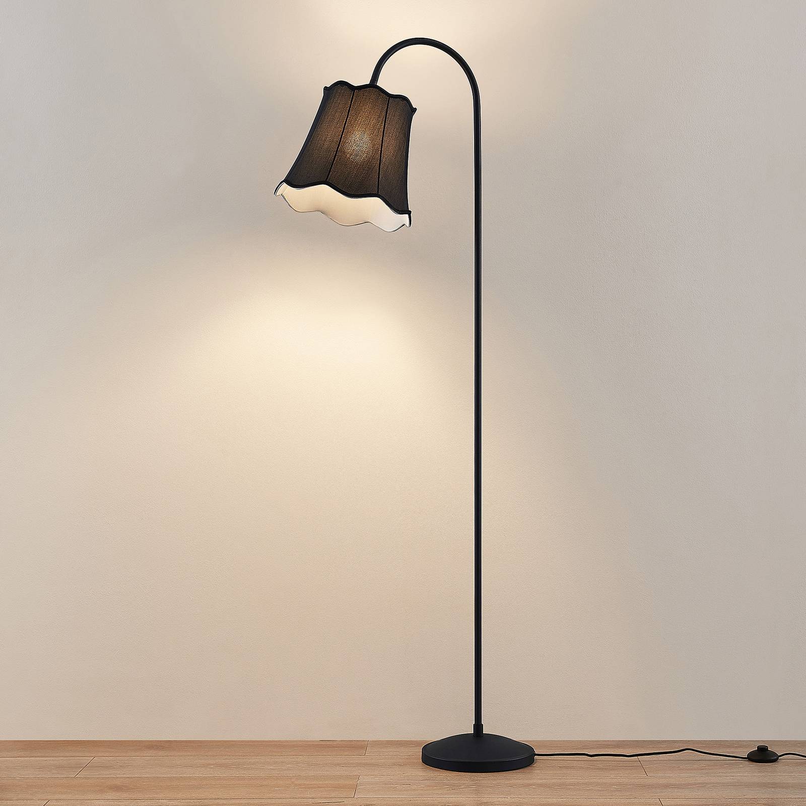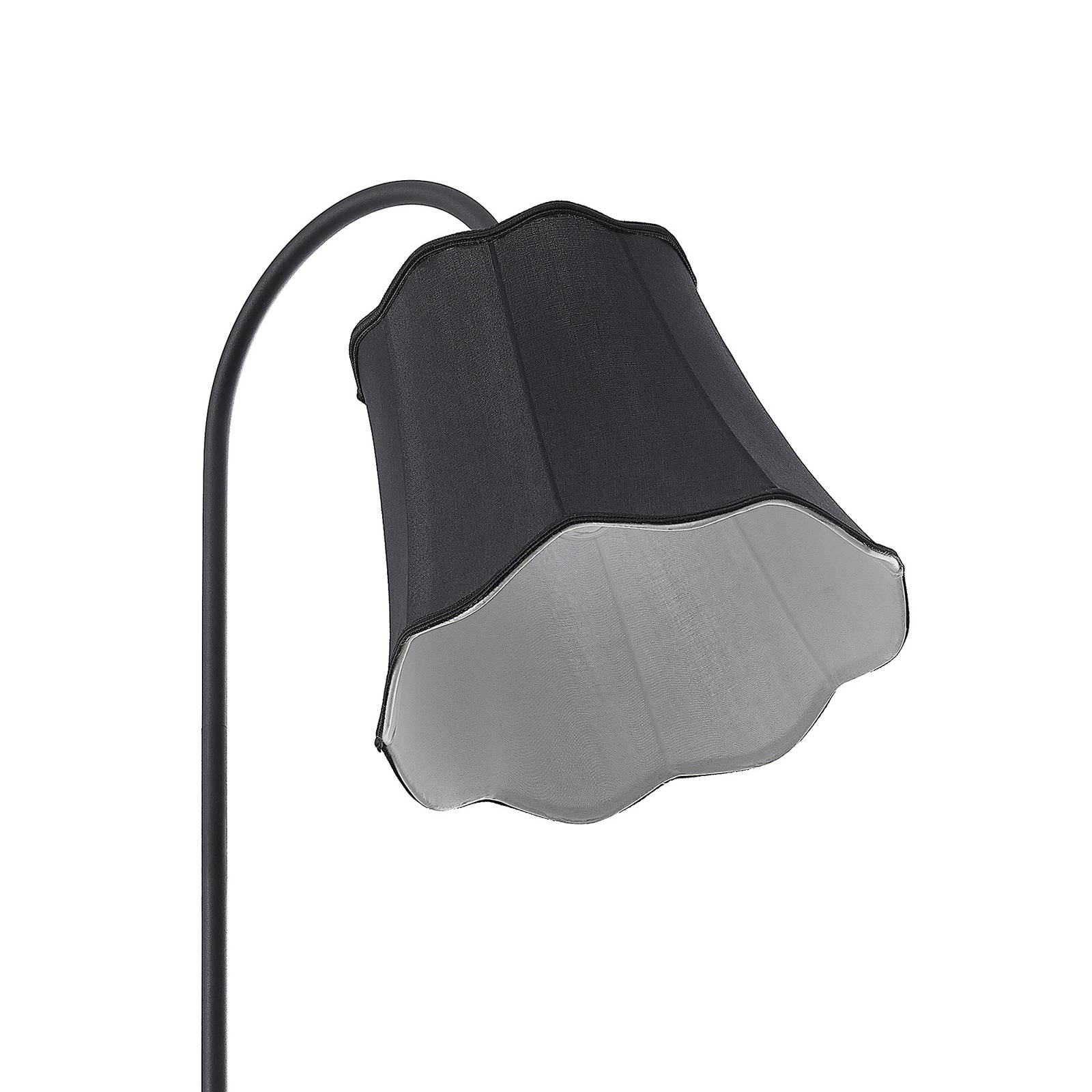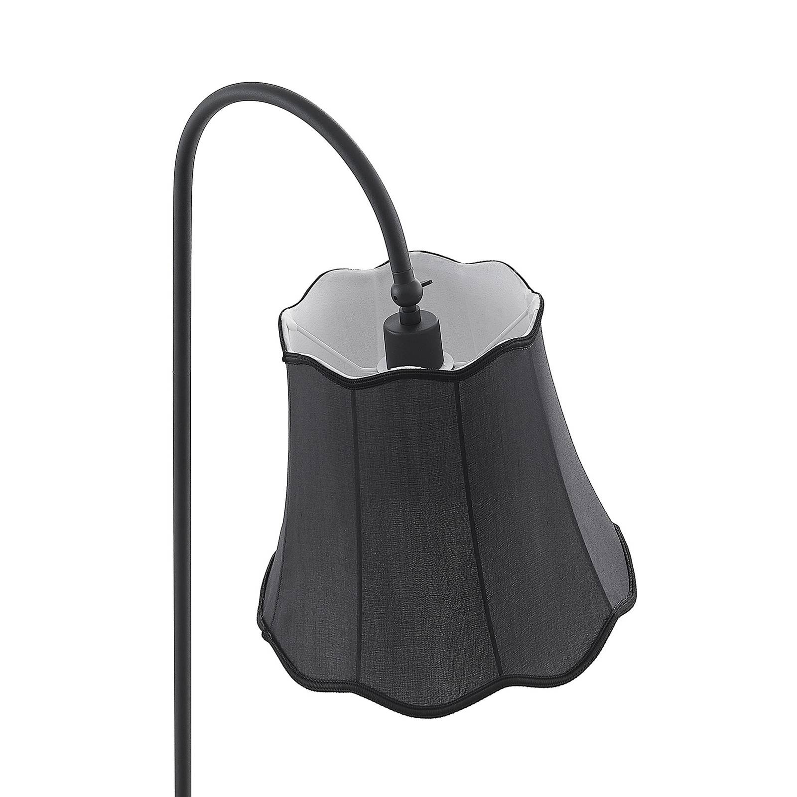Lampada da terra in tessuto nero Binta con paralume in tessuto nostalgico - design esclusivo Binta ha caratteristiche inconfondibilmente nostalgiche ed è una lampada da terra che potrebbe provenire da decenni passati. Il paralume in tessuto è rotondo e termina con un bordo ondulato nella parte superiore e inferiore, che sottolinea questa impressione. Inoltre, la cornice, come il paralume, è tenuta in nero, in modo da creare un'unità visiva che crea un'armonia speciale. Inoltre, la luce è particolarmente morbida e accogliente. La lampada da terra può essere usata altrettanto bene in camera da letto che in soggiorno e come lampada da lettura.