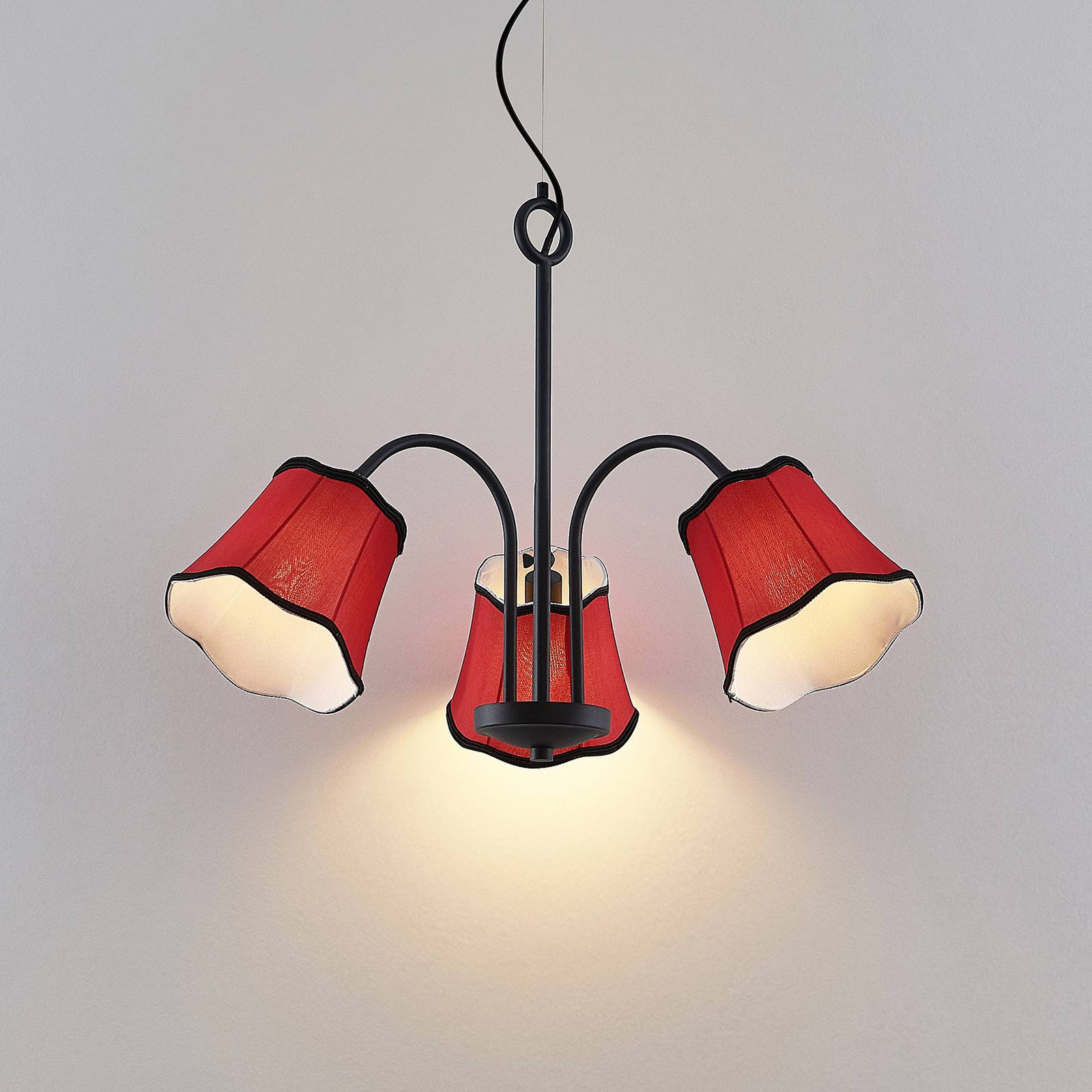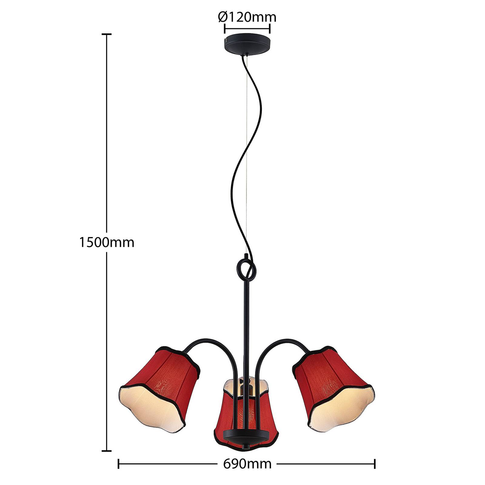 Lampada da sala da pranzo a tre luci Binta con paralumi in tessuto rosso ruggine Binta convince con un look nostalgico che ricorda decisamente le lampade di un tempo e diffonde un bel tocco vintage. Al telaio nero sono fissati un totale di tre paralumi in tessuto, che emettono la loro luce principalmente verso il basso, mentre la luce della stanza ha un effetto particolarmente morbido e accogliente. La superficie rosso ruggine diffonde calore e intimità e fa una dichiarazione speciale nella scelta del colore. Il design della lampada a sospensione è caratterizzato da un tocco esclusivo e può essere integrato bene negli stili classici, anche se Binta può essere utilizzato anche in stanze moderne se si combinano gli interni in modo intelligente e si punta sui contrasti.