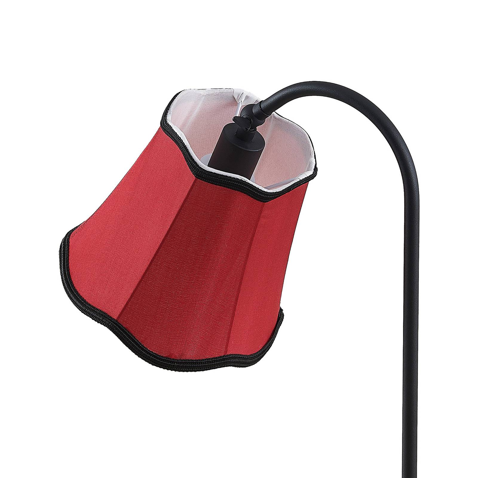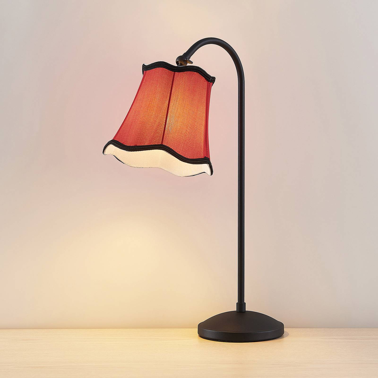 Lampada da tavolo di design nostalgico Binta con paralume rossastro in look vintage e cornice nera Binta è un bell'oggetto di illuminazione per il soggiorno e la camera da letto, dove viene utilizzato un design esclusivo, che tuttavia non manca di riferimenti alle forme tradizionali delle lampade e appare quindi particolarmente nonalgico. Dalla base rotonda, una cornice sale verso l'alto, che è curva nella parte superiore e poi conduce al paralume in tessuto, che è in un caldo rosso ruggine e ha un bordo nero e ondulato. I due colori - la cornice è anche nera - sono tanto armoniosi insieme quanto contrastanti e creano un accento accattivante nel soggiorno. La lampada da tavolo può essere accesa e spenta rapidamente con l'interruttore nella linea di alimentazione.