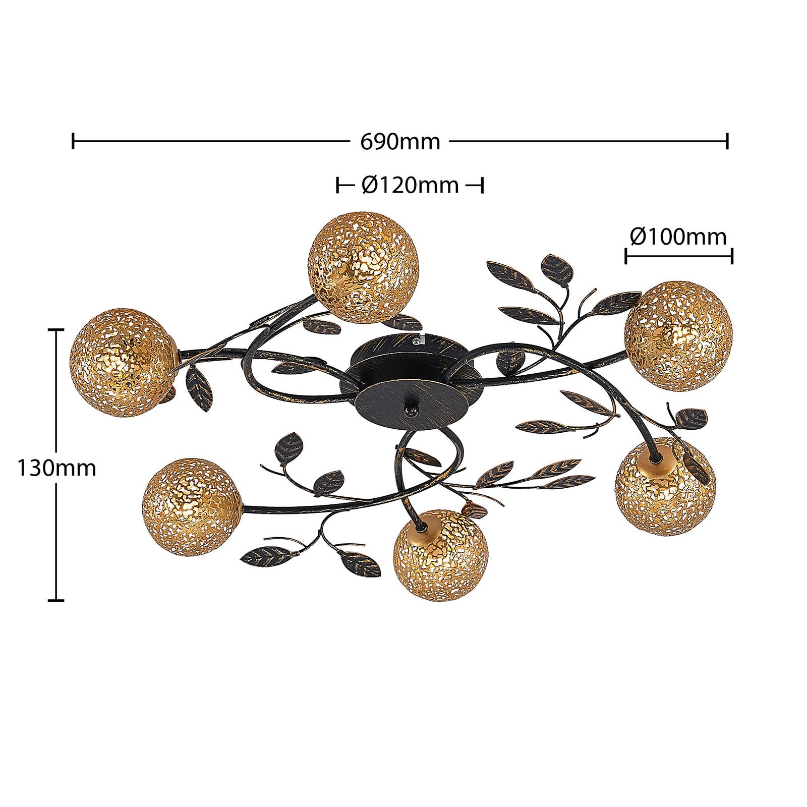 La plafoniera Evory combina elementi floreali e orientali in un'opera d'arte Evory è una lampada da soffitto che combina sapientemente elementi floreali e orientali. È costituito da un pannello circolare per il soffitto. Da lì, tre bracci di lampada sporgono nella stanza. Ai lati i bracci della lampada sono decorati con foglie. Sembra che i viticci floreali trovino la loro strada nella stanza. Il tocco orientale è dato alla lampada dai paralumi. Questi sono fatti di metallo e sono tenuti in oro. La cosa speciale delle tonalità è il motivo fine, che viene creato da incavi nel metallo. Questo modello ricorda le lampade d'Oriente. Allo stesso tempo prevede romantici giochi di luce.