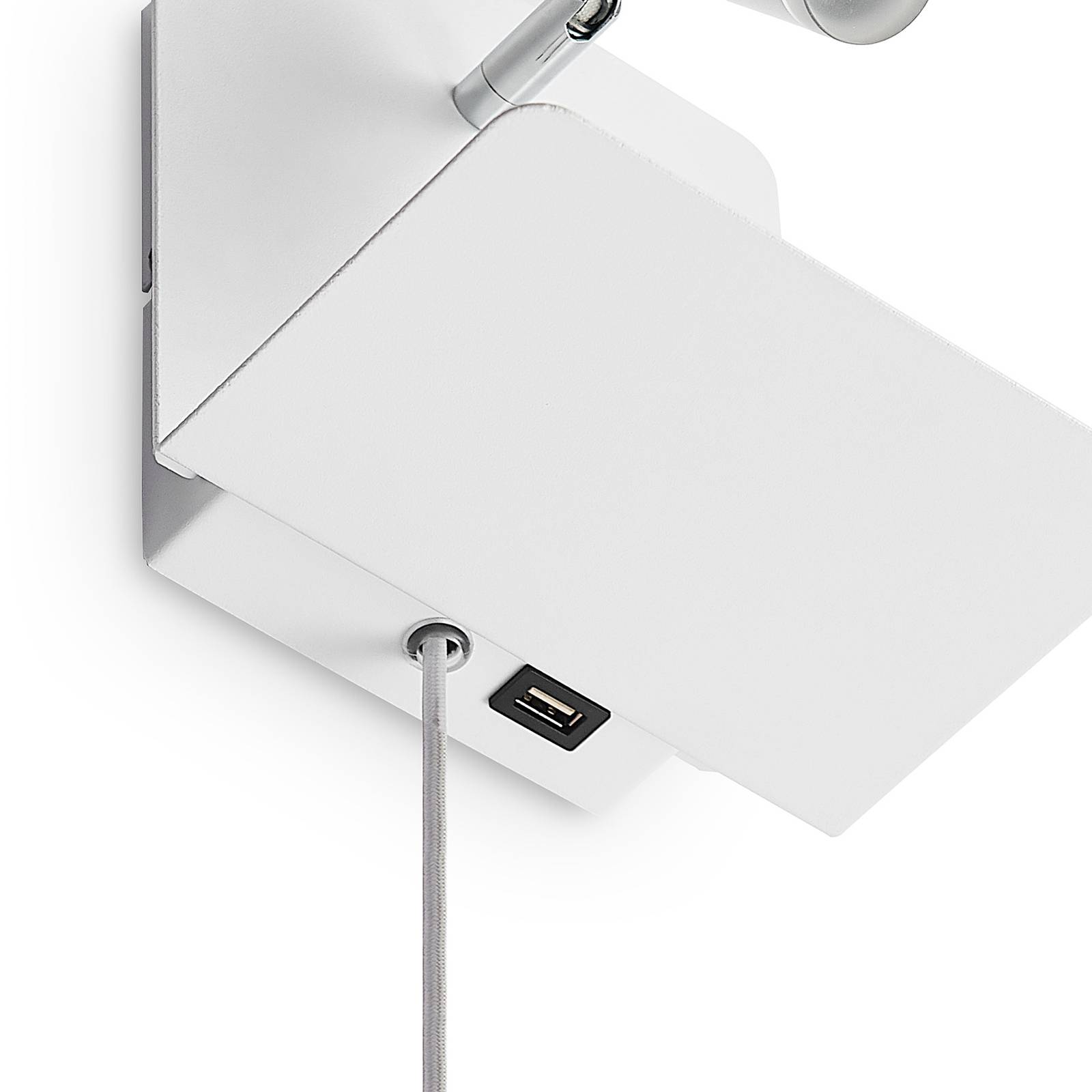 Lampada LED da parete Zavi - versatile grazie alla porta USB e alla mensola integrate Questa sofisticata lampada convince per il suo aspetto neutro, che la rende integrabile in modo flessibile in diversi ambienti. La luce viene emessa verso il basso, in modo che l'area sottostante la sorgente luminosa sia ben illuminata. Il pratico faretto può anche essere inclinato di 120 gradi e ruotato di 340 gradi intorno al proprio asse. L'applique a LED Zavi è dotata di una seconda lampada LED che emette indirettamente dal lato e illumina la parete, creando bellissimi accenti luminosi. È inoltre dotata di un ripiano integrato e di una porta USB, in modo che Zavi possa essere utilizzata anche come stazione di ricarica per uno smartphone