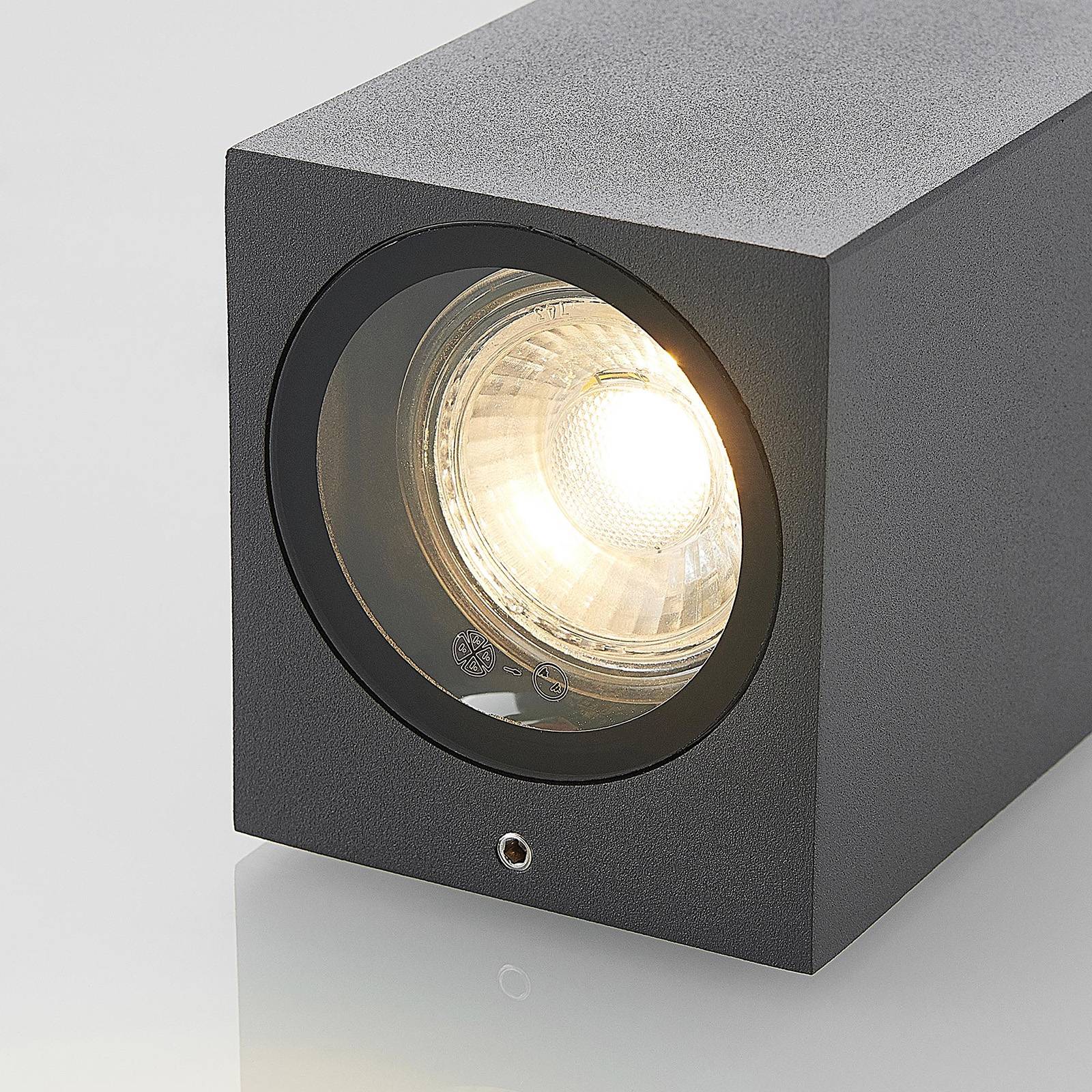 Applique da esterni Lavina in alluminio grigio scuro Il design in stile industriale fa di Lavina un faretto da esterni adatto a un contesto architettonico moderno. Il colore grigio scuro, sempre attuale, ne rafforza il carattere universale. Questo faretto quadrato è perfetto per illuminare lo spazio esterno, anche grazie all'associazione di due materiali robusti: alluminio pressofuso e vetro temperato. Per la sua forma compatta, questa applique da esterno si fonde con la parete e illumina lo spazio con discrezione. Se si monta la lampadina adatta, è anche possibile regolare l'intensità luminosa. - IK06