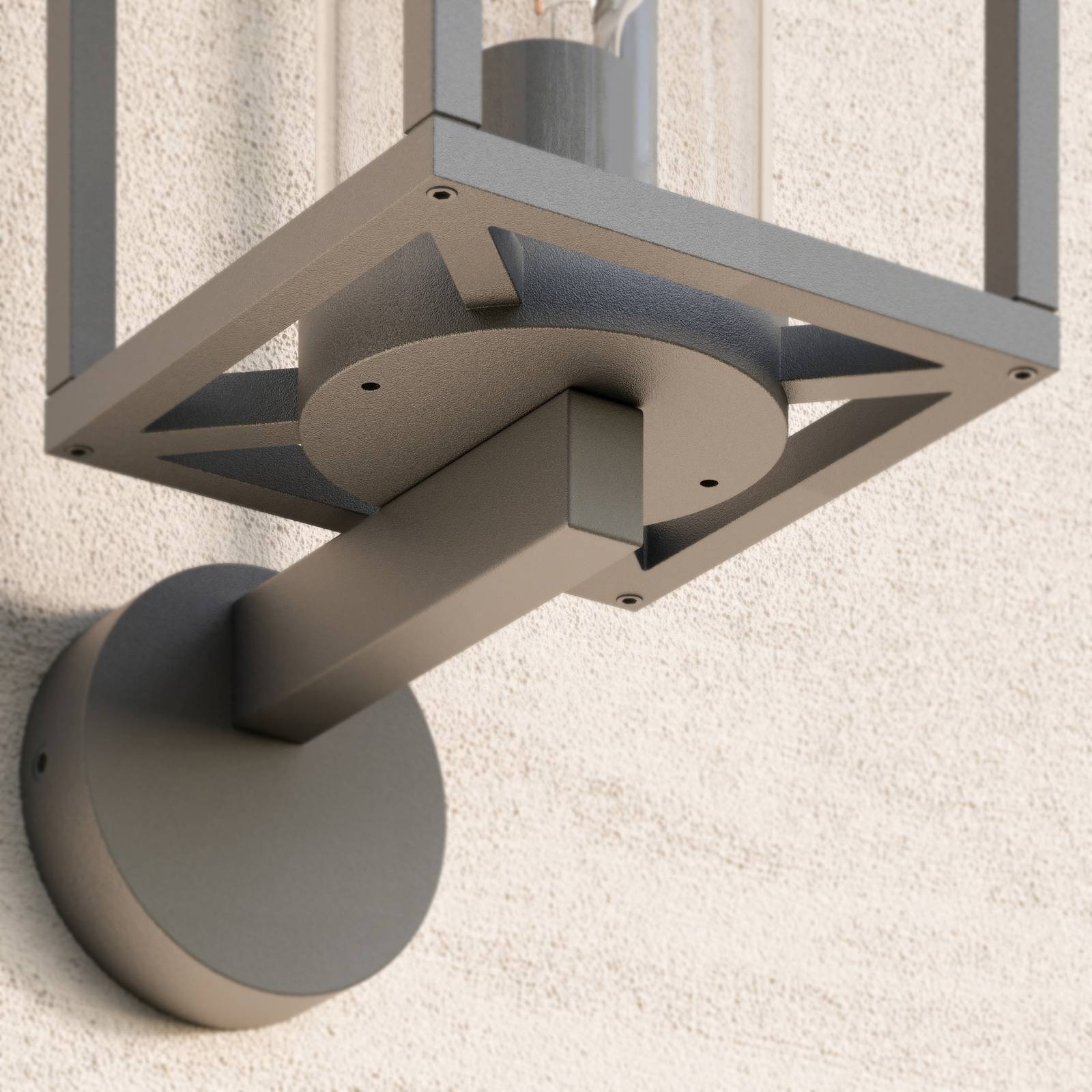 Illuminazione fidata all'esterno - applique da esterni Ferda in alluminio Il design dell'applique da esterni Ferda combina linee angolari e rotonde. Il paralume aperto presenta la forma di una moderna lanterna. La lampadina rimane chiusa da un cilindro di vetro trasparente. L'illuminazione si diffonde tutto intorno con un effetto vivace. Questo aumenta la sicurezza intorno alla casa e forma anche un bel colpo d'occhio, ad esempio sulla facciata.