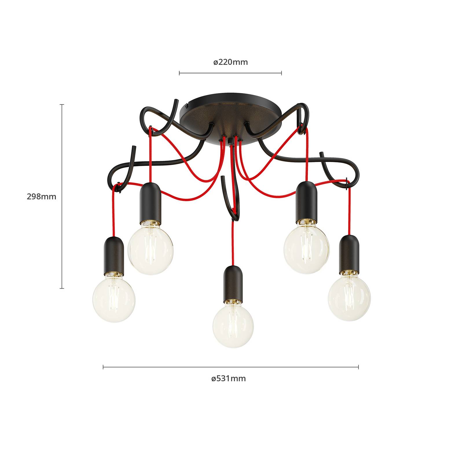 Elegante plafoniera Jorna con un cavo tessile rosso La plafoniera Jorna si presenta nella sua versione a cinque fiamme. Il suo design si basa sulla fiducia stilistica e sull'attenzione ai dettagli. Se si entra nella stanza, cattura immediatamente l'occhio con il suo concetto speciale, che è particolarmente attraente per gli individualisti. Ha una staffa rotonda da soffitto in ferro e cinque bracci della lampada, che sono curvi e girati verso l'interno all'estremità. Dal centro della staffa del soffitto pendono liberamente cinque cavi tessili rossi, che sono anche attaccati all'estremità dei bracci della lampada. I cavi tessili rossi forniscono un contrasto di colore deliberato che rende questo apparecchio un eye-catcher, e si fondono direttamente nelle prese. Con questo sorprendente design, si è rinunciato a un paralume, in modo che la luce possa dispiegarsi direttamente e senza ostacoli nella stanza. La scelta dell'illuminante appropriato è lasciata all'utente. Il carattere decorativo di questo apparecchio è sottolineato soprattutto da una sorgente luminosa ben scelta - le lampade in vetro G95 con la moderna tecnologia LED sono ideali per questo scopo. Questi sono particolarmente vantaggiosi per il loro consumo economico di energia. La plafoniera Jorna può essere utilizzata per valorizzare le proprie quattro mura, così come nel settore della ristorazione o dell'hotel.