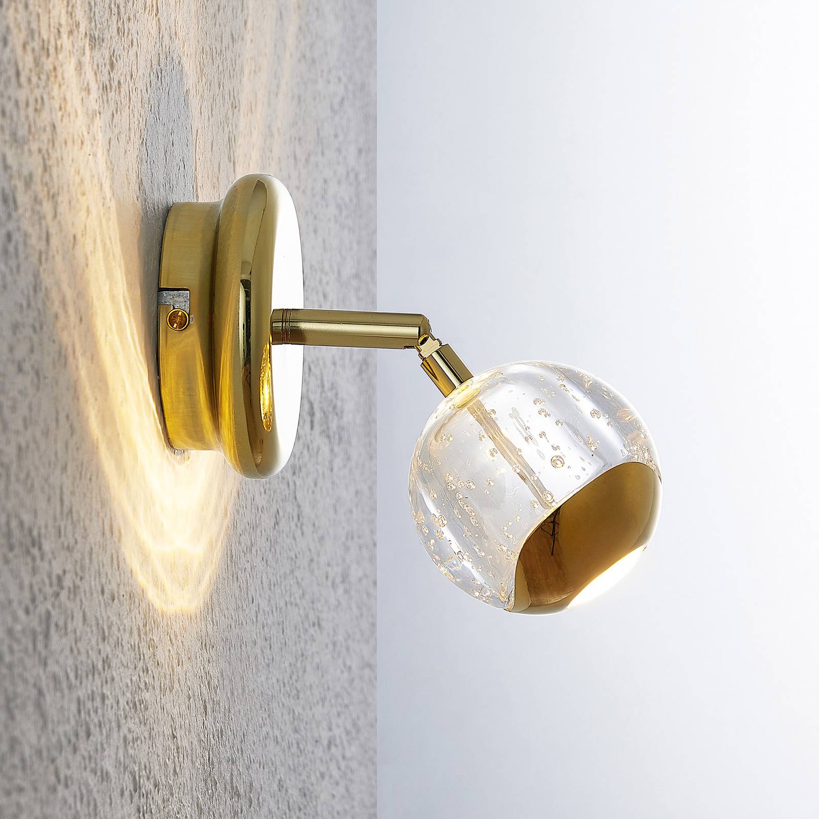 Spot LED monolampada Kilio con vetro a bolla e finitura dorata Kilio è uno spot LED che può essere utilizzato splendidamente in un ambiente classico con la sua nobile finitura in oro. La superficie brilla magnificamente e ha un effetto caldo, mentre il vetro a bolle a forma di sfera crea un contrasto degno di nota e ha anche un'influenza duratura sull'effetto luminoso, poiché crea una bella immagine luminosa sulla parete. Poiché lo spot è dotato di LED, Kilio può fornire una luce adeguatamente luminosa in modo economico ed efficiente. Inoltre, la testa della luce può essere ruotata e orientata per una maggiore flessibilità.