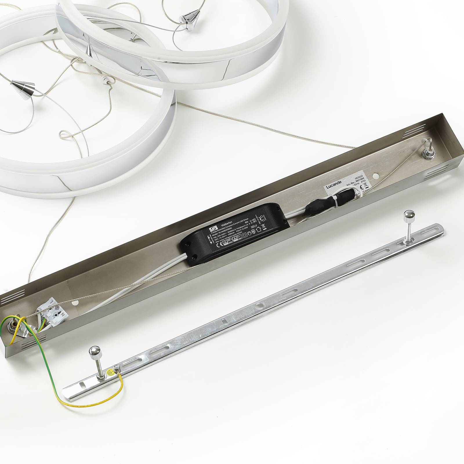 Lampada LED a sospensione Lyani a 2 luci, dimmerabile, ideale per la zona pranzo Lyani è ideale per illuminare un tavolo da pranzo. I due paralumi sono costituiti ciascuno da un anello di metallo cromato lucido e insieme producono una luce intensa. Tuttavia, se necessario, la luminosità può essere regolata in tre fasi. Per utilizzare questa funzione, si spegne e si riaccende la luce con il normale interruttore.