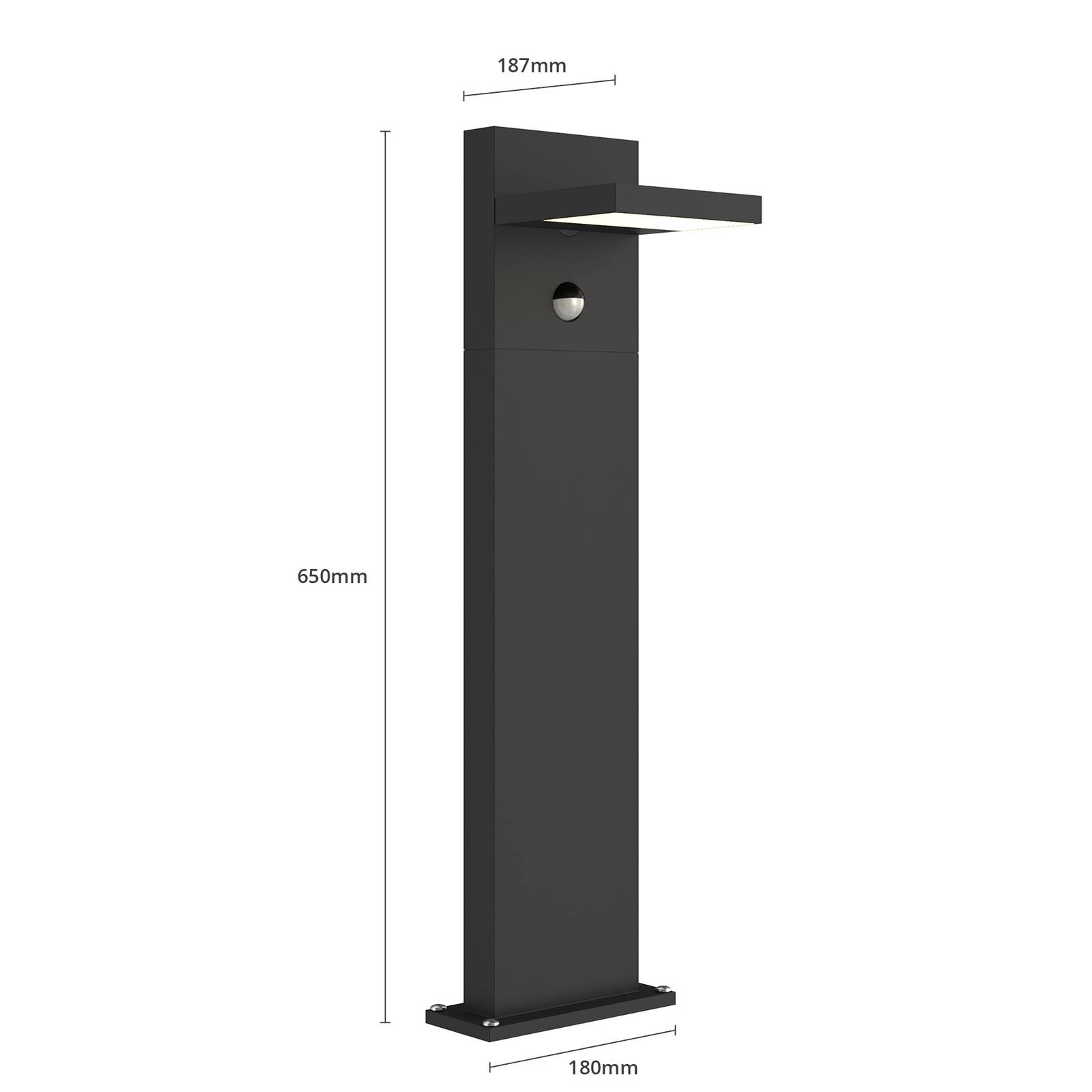 Lampione a LED Silvan grigio scuro con sensore Il lampione a LED Silvan, con sensore integrato, garantisce una luce piacevole con comando intelligente. Il sensore comanda l'accensione della luce all'occorrenza, mentre il design sempre attuale si integra in diversi contesti architettonici. Un'elegante struttura in metallo grigio scuro sostiene un corpo illuminante orientabile. Essa ospita un diffusore opalino che distribuisce uniformemente la luce delicata nella direzione impostata. Il sensore integrato reagisce al movimento comandando l'accensione della luce. La durata di accensione è regolabile. La lampada versatile è completata da un alloggiamento in alluminio leggero ma resistente. Dati del sensore di movimento: - Raggio d'azione 6-10 m - Durata di accensione regolabile (da 5 secondi a 6 minuti) - Angolo di rilevamento 120°