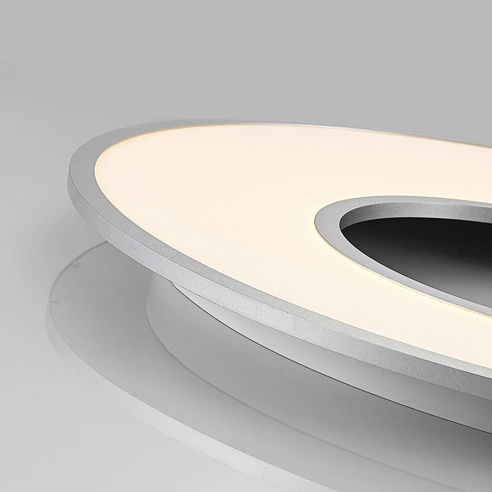 Plafoniera Durun circolare con funzione cambio colori e forte luminosità La plafoniera LED Durun ha un paralume con un'apertura circolare non del tutto centrata. La finitura è in elegante color argento. La lampada convince non solo per estetica ma anche per la sua funzionalità. Attraverso l'interruttore a parete si può adattare il colore della luce a tre livelli, cosa possibile anche con il telecomando fornito in dotazione. Con quest'ultimo si può anche adattare la luminosità. Il dimming è in regolazione continua 10-100% oppure a 15 singoli livelli. Sia per la tonalità di luce che per l'intensità c'è una funzione memory che ripropone i valori impostati all'accensione successiva. Inoltre la plafoniera LED Durun può funzionare in una modalità notturna oppure con un timer che spegne automaticamente la luce dopo 15 minuti.