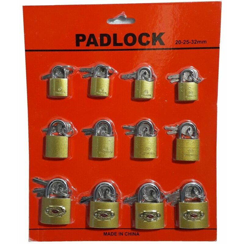Set da 12 lucchetti di varie misure. Ideali per armadietti, valige, ecc. Specifiche Con 2 chiavi 4 Lucchetti da 20mm 4 Lucchetti da 25mm 4 Lucchetti da 32mm