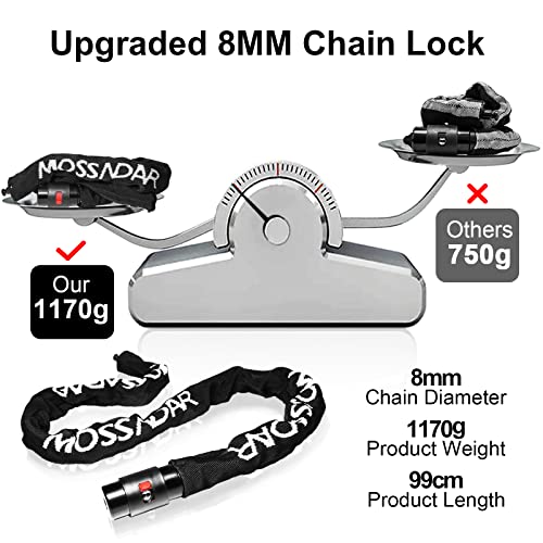 【Robusto Lucchetto per Bici】Protezione sicura, aggiornamento della qualità! Il diametro catena bici è stato aggiornato da 6 mm a 8 mm e la lunghezza è stata aggiornata a 99 cm. Il lucchetto per bicicletta è realizzato in acciaio legato di alta qualità resistente alle alte temperature, all'usura, al taglio e alla violenza e pesa fino a 1170g.