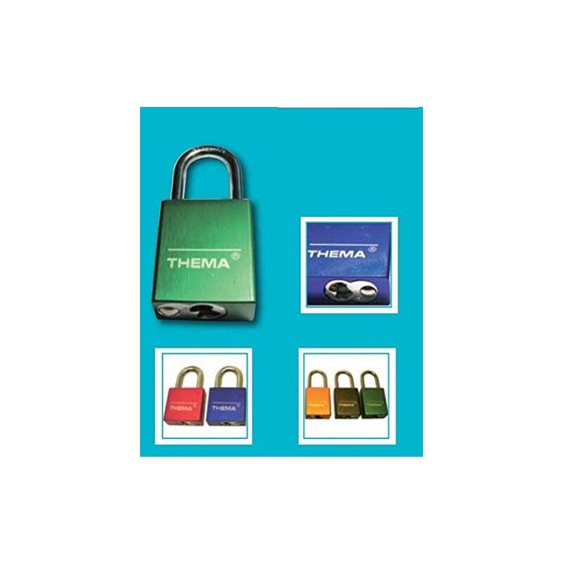 Lucchetto ad arco in solido ma leggero alluminio colorato resistente alla corrosione con 3 chiavi, gancio cementato, temperato e cromato, colori assortiti: blu, rosso, verde, giallo, marrone. linea quality dimensioni 50 mm