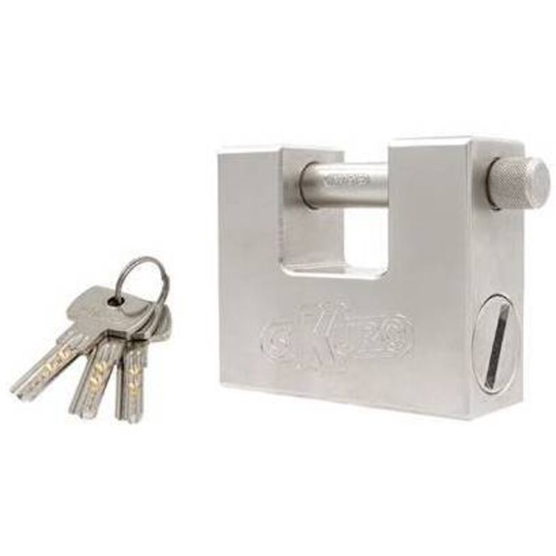Monoblocco in acciaio carbonitrurato cromo lucido. Asta di chiusura in acciaio cementato cromato. Cilindro di sicurezza a 6 pistoncini dotato di piastrina Defender antitrapano e antieffrazione. Chiave estraibile a lucchetto chiuso. Pistoncini e contro-pistoncini in ottone. Molle in bronzo fosforoso. Fornito con 3 chiavi punzonate.