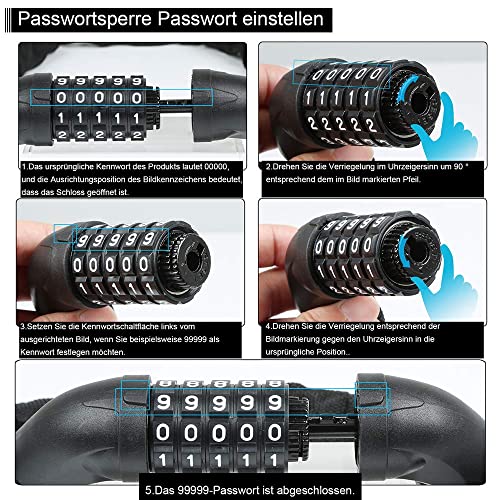 Il blocco password a 5 cifre può essere resettato:L'impostazione di fabbrica è 00000. Può essere facilmente modificata in base alla combinazione desiderata.Seguire le istruzioni per modificare la combinazione richiesta.