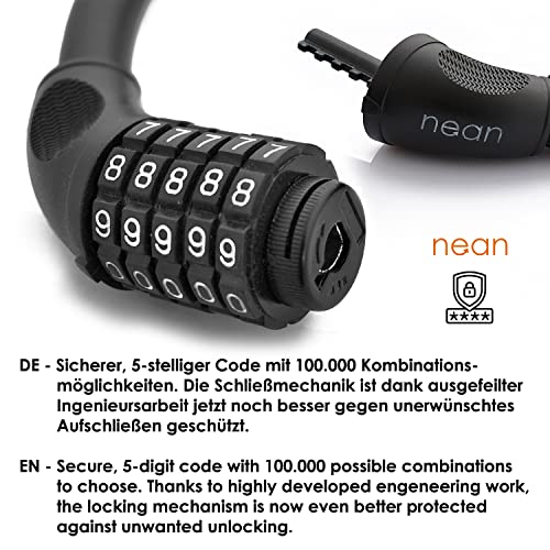 Nean - Lucchetto per bicicletta con combinazione numerica, extra spesso, superficie Soft Touch, nero, 20 x 1000 mm