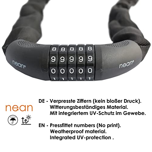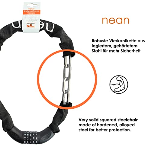 Nean, lucchetto a catena per bicicletta, lucchetto con numeri, codice di combinazione, Maglia della catena quadrangolare, Nero, 6 x 6 x 900 mm