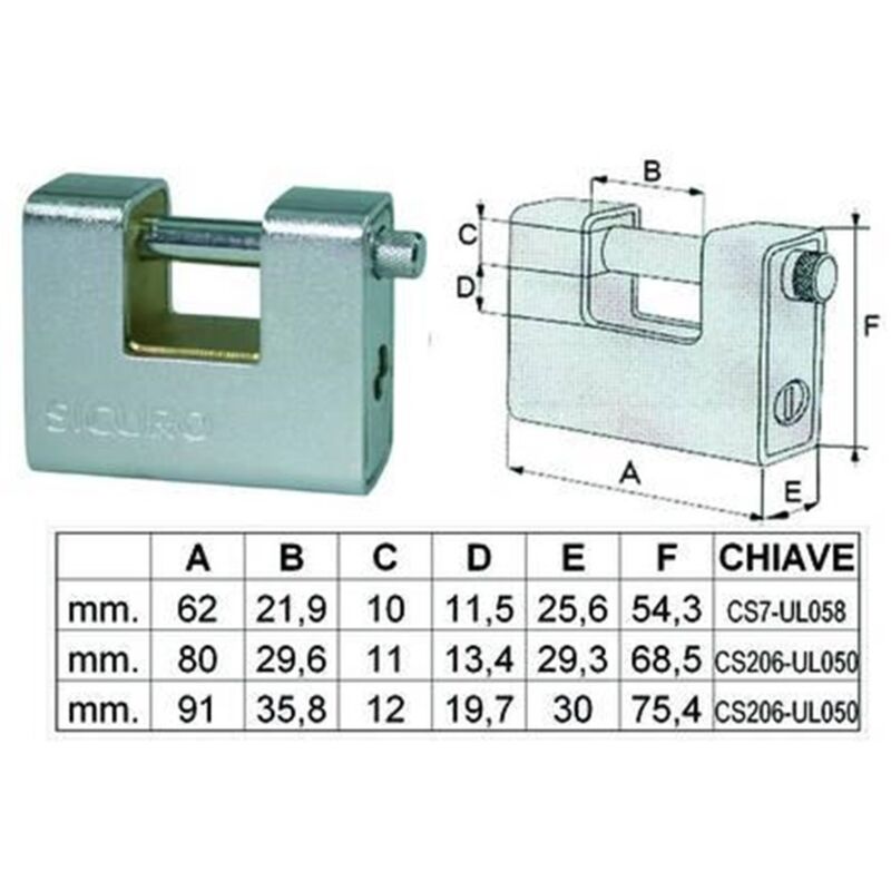 LUCCHETTO CORAZZATO A UNA BOCCA - mm.60 corpo monoblocco in ottone rivestito interamente da una corazza in acciaio cromato, cilindro con 3 chiavi a 5 spine
