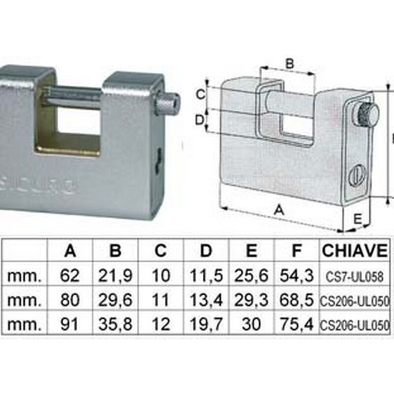 LUCCHETTO CORAZZATO A UNA BOCCA - mm.90 corpo monoblocco in ottone rivestito interamente da una corazza in acciaio cromato, cilindro con 3 chiavi a 5 spine
