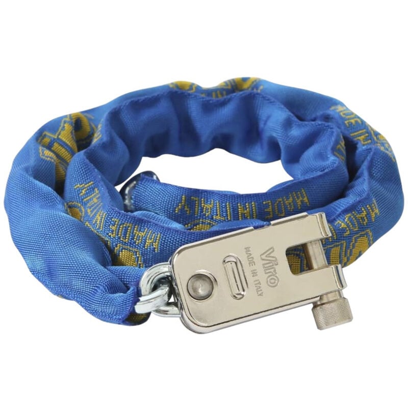 CARATTERISTICHE Lucchetto in ottone corazzato in acciaio cementato, temprato, ramato e nichelato Asta di chiusura rotante antitaglio con testa riportata contro lo strappo Barilotto a 4 pistoncini in ottone con protezione contro lo strappo 2 chiavi in dotazione in ottone nichelato a profilo Viro Chiusura di tipo positivo Chiave estraibile solo a lucchetto chiuso Contropistoncini in ottone a fungo contro l'azione del grimaldello Sfera di bloccaggio in acciaio inox Catena semiquadra per contrastare le troncatrici manuali che hanno generalmente lame taglienti adatte a trattenere i profili tondi La catena è rivettata al MORSO con un perno in acciaio inox e ricoperta da guaina di protezione di colore blu in tessuto che minimizza l'ingombro e antigraffio Lunghezza 60 cm.