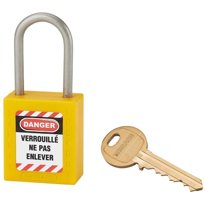Dettagli: Meccanismo a perno Grillo in acciaio inox Fornito con un set di 3 etichette con numero di chiave inciso sulla serratura Doppio ancoraggio Colore: giallo Larghezza: 40 mm Grillo in acciaio inox: Ø 4,76 mm Altezza: 38 mm Applicazione: Lucchetto resistente agli urti, al calore e alla corrosione. Ideale per applicazioni elettriche. Dotazione: Fornito con un set di 3 etichette con incisione del numero di chiave sul lucchetto. Caratteristiche