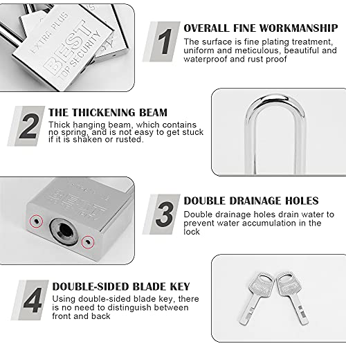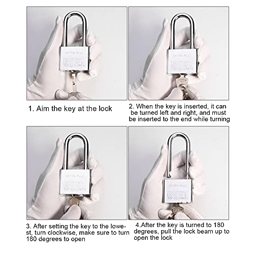 Materiale: lucchetto a arco lungo con 4 chiavi in ferro cromato, nucleo di lucchetti impermeabile per aumentare la sicurezza, durevole e pratico.