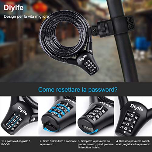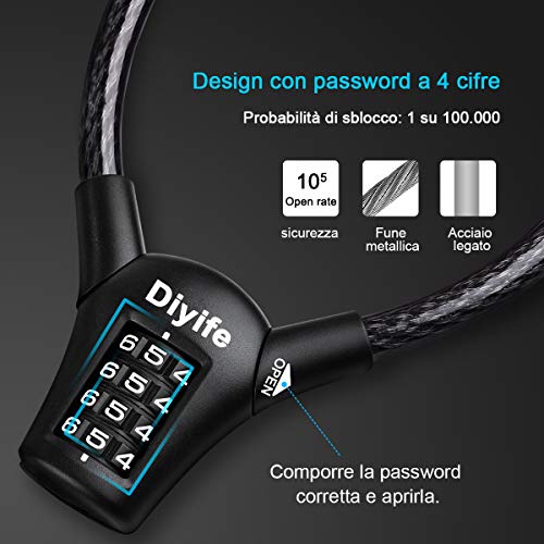 Lucchetto Bici, [Impermeabile][1,5 m] Diyife Lucchetto Combinazione Bici A 4 Cifre, Lucchetto Per Bicicletta Cavo di Sicurezza per Bici per Motociclette, Scooter, Acciaio Inossidabile Antitaglio