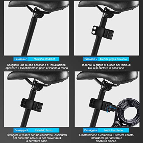 【Combinazione-Nessuna Chiave Richiesta】 Il codice a 4 cifre offre 10000 tipi di combinazioni, una forte sicurezza. Non ci sono più chiavi per bloccare la bici. Le parti cifrate sono lavorate con precisione e non cadranno, garantendo un funzionamento regolare. È anche molto semplice ripristinare il codice.