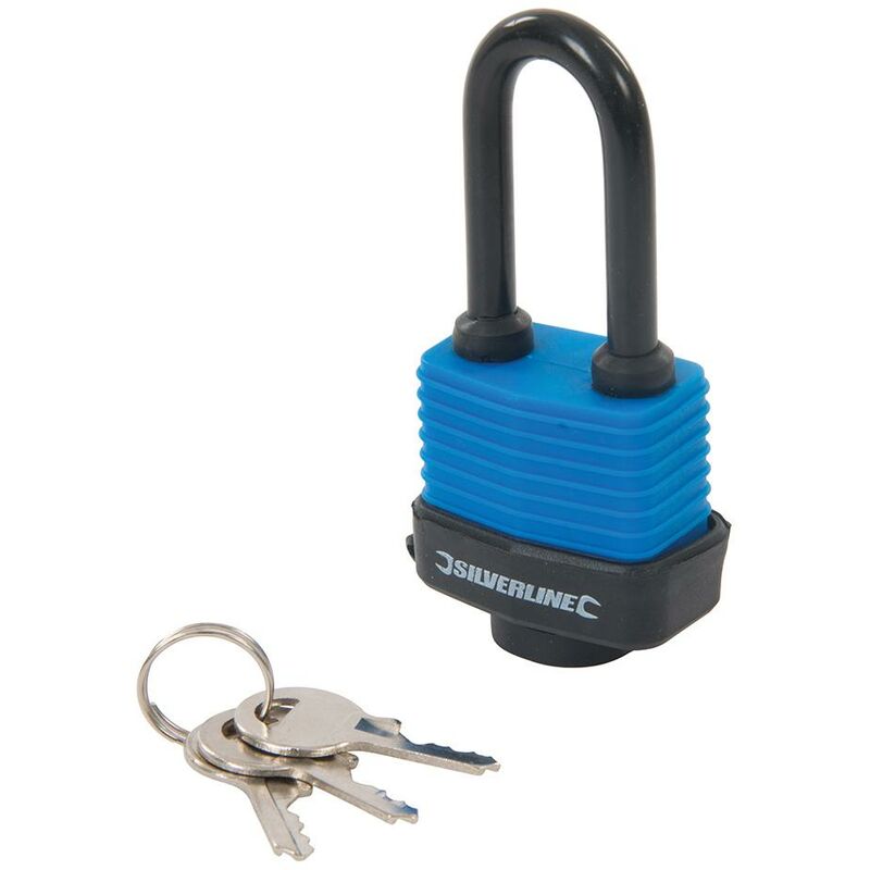 Meccanismo di ottone massiccio. Gommini di protezione di gomma sull'arco e base di protezione per la resistenza agli agenti atmosferici. Include 3 chiavi in acciaio. Corpo (H x L x l): 97,5 mm x 48 mm x 41 mm. Giogo orizzontale gambo: 18,5 mm. Giogo verticale gambo: 50 mm. dia arco: 7,5 mm. Corpo in acciaio e gambo con rivestimento in gomma Meccanismo di bloccaggio cilindro in ottone Gambo e base resistenti agli agenti atmosferici Include 3 chiavi ø gambo: 7,5 mm