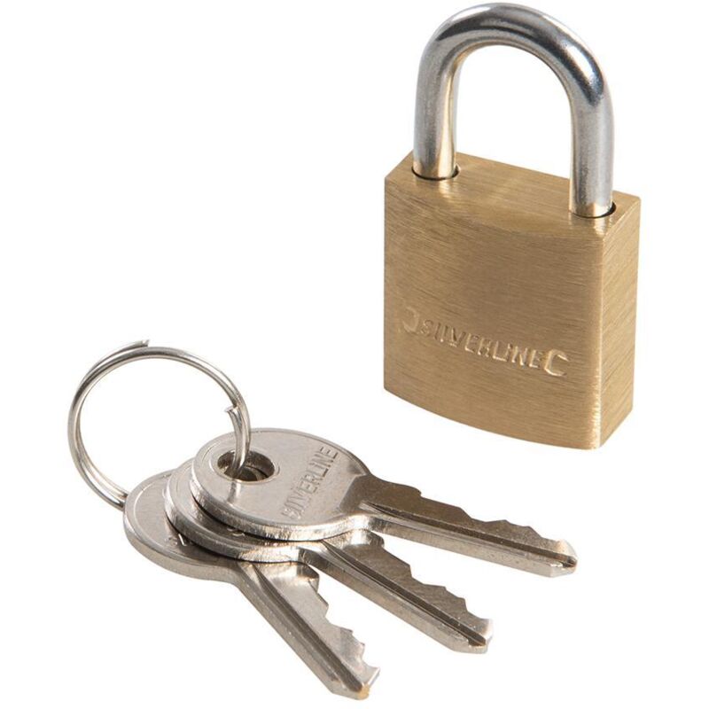 Lucchetto 20 mm. Corpo in ottone massiccio e meccanismo di ritenuta multi-perno. Gambo in acciaio indurito cromato. Include 3 chiavi. Diametro gambo: 3,5 mm. Peso 0,05 Kg