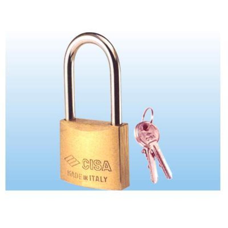 Corpo in ottone, con arco in acciaio carboniturato nichelato, perni e catenacci interni in ottone con doppia chiusura, molle in bronzo, due chiavi in dotazione Larghezza mm. 30