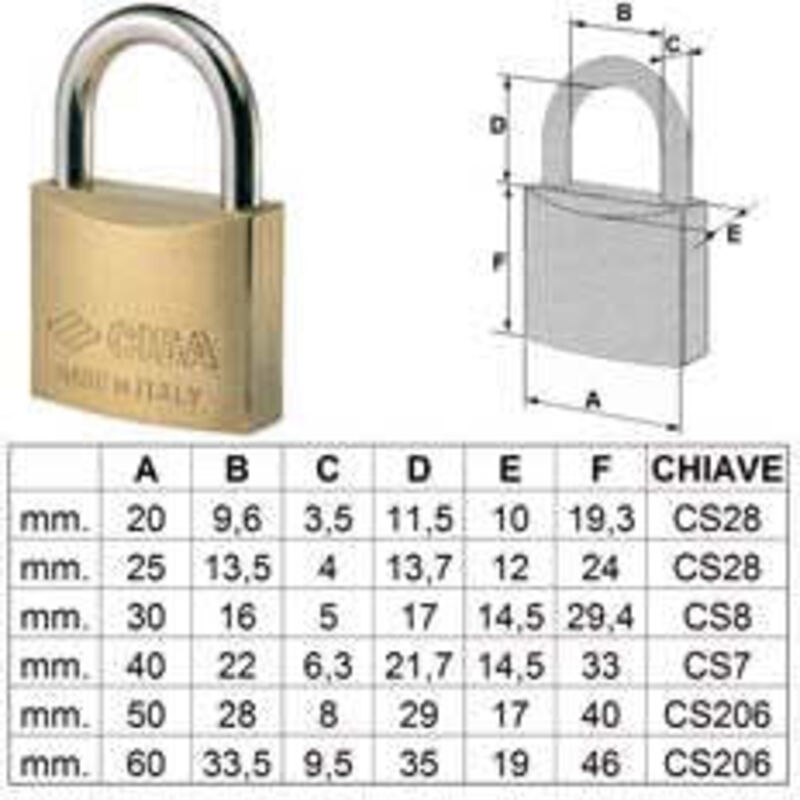 Corpo monoblocco in ottone smerigliato, arco in acciaio carbonitrurato nichelato, dotazione 2 chiavi