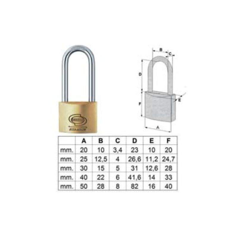 Mm.40 (pl1824000) corpo monoblocco in ottone satinato, arco in acciaio carbonitrurato, doppio scrocco da lucchetti > mm.30, spina antigrimaldello per lucchetti > mm.30, dotazione 2 chiavi Categoria merceologica: Lucchetti e accessori - Sicurezza - Lucchetti ad arco