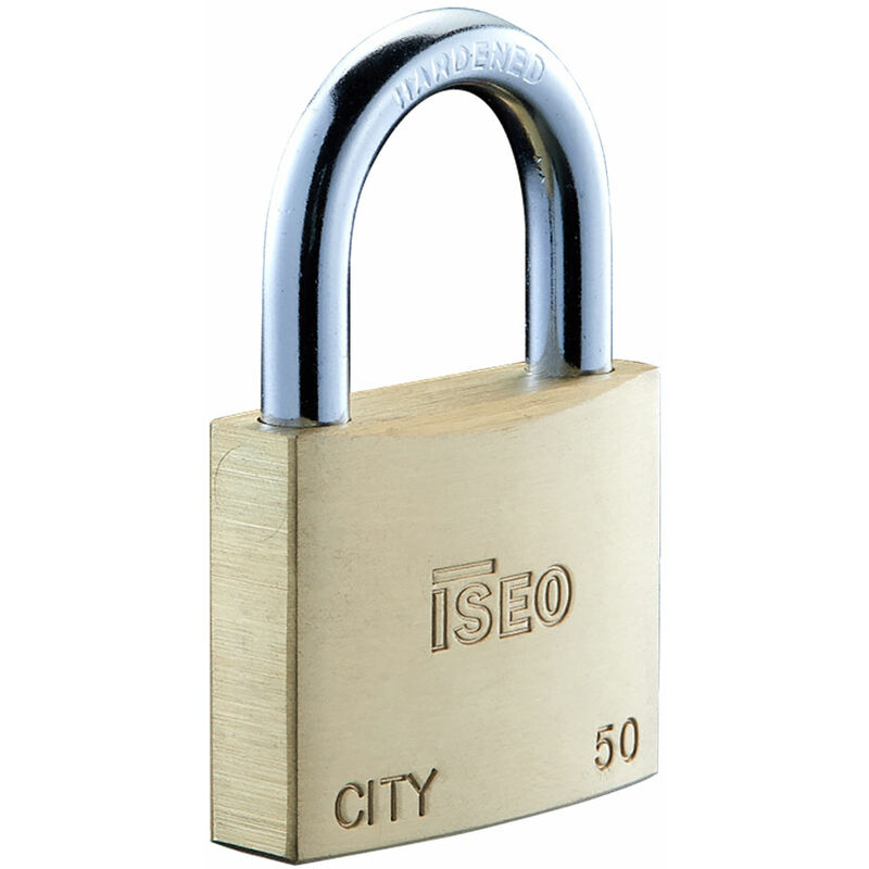 Corpo in ottone, arco in acciaio cromato. Dotazione 3 chiavi.