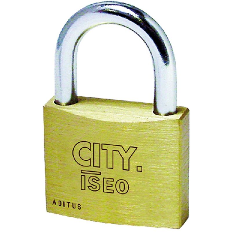 Corpo in ottone satinato e verniciato. Arco in acciaio temperato e cromato. In dotazione 3 chiavi.