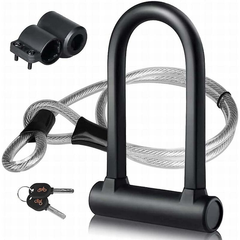 Robusto e durevole: Il lucchetto a U per bicicletta per impieghi gravosi è realizzato con un grillo in acciaio temprato ad alte prestazioni che resiste al taglio e agli attacchi di leva. Dimensioni (L, L): 19,5 cm x 13 cm Più sicuro: I lucchetti per mountain bike cantano efficacemente il nucleo del lucchetto in lega di zinco e la complessa fessura della chiave a serpentina contro vari mezzi di furto. Maggiore protezione: La combinazione di lucchetto a U per bici con cavo ad anello in acciaio può fornire una maggiore protezione per il fissaggio della ruota anteriore o degli accessori. Con un cavo in acciaio di alta qualità da 4 piedi consente una maggiore flessibilità di bloccaggio. Per bicicletta, moto, elettromobile. Design u0026 Performance: Lo strato di gel di silice rivestito protegge il lucchetto della bicicletta d-lock per evitare graffi. Lucchetto per bici impermeabile con staffa di montaggio, nessun imballaggio aggiuntivo richiesto. Con 2 chiavi: Set di lucchetti per bici con
