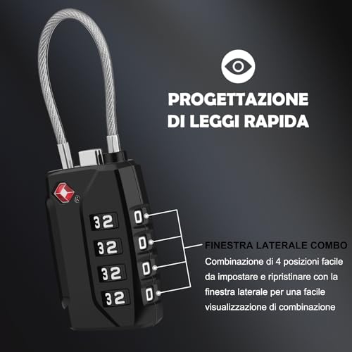 【Alta Qualità】Il corpo di ogni serratura è realizzato in una lega di zinco ad alta resistenza e il cavo è in acciaio resistente e resistente al taglio. L'unico modo per aprire la serratura è con l'apposita chiave TSA o conoscendo la combinazione. Puoi viaggiare sicuro sapendo che i tuoi bagagli sono protetti.