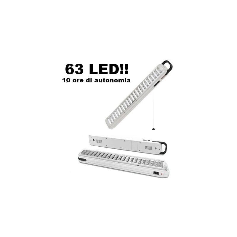 Lampada a LED ricaricabile, grazie ai suoi 63 LED potrete affrontare senza problemi qualsiasi interruzione di energia elettrica.libertàLa lampada si attiva automaticamente in caso di assenza di energia dalla rete. Possiede due possibili regolazioni di luminosità, la potente batteria da 3200 mAh rende possibile un'autonomia di ben 10 ore.libertàLa lampada dotata di fori per il fissaggio a muro sia verticale che orizzontale, laccetto per una comoda accensione e supporto per l'utilizzo portatile.libertàLeggera e maneggevole trova applicazione anche come lampada d'emergenza per auto, campeggio, pesca ecc. Ecc.