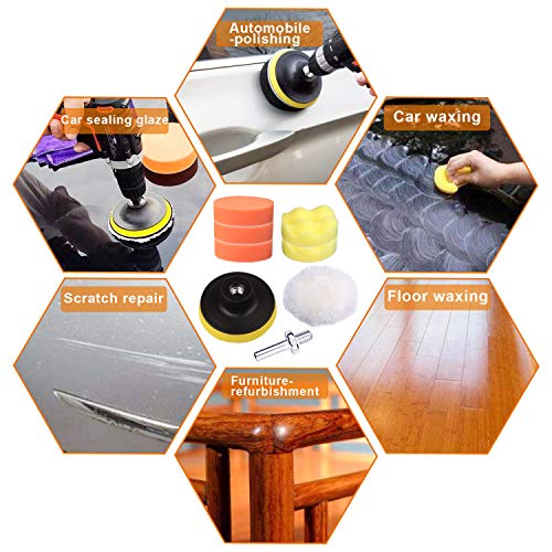Dimensioni del prodotto: la spugna per lucidatura è di 3 pollici e la vite di collegamento ha un diametro del foro di M10, dotata di adattatore standard per il collegamento della lucidatrice, adatta per tutti i tradizionali trapani M10, avvitatori a batteria e lucidatrici.