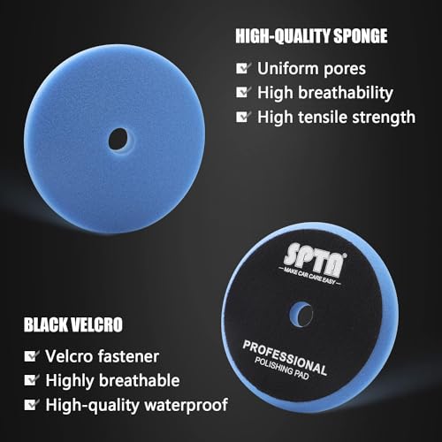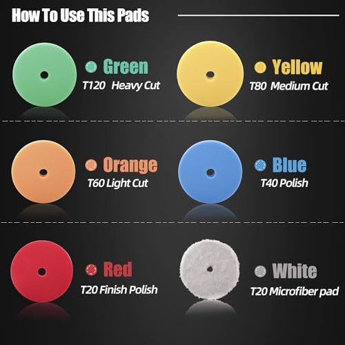 ◆ Ci sono cinque diversi colori di spugna pad con durezza diversa: verde/giallo/arancio/blu/rosso, taglio efficiente e lucidatura del rivestimento auto ossidazione più difficile, graffi.