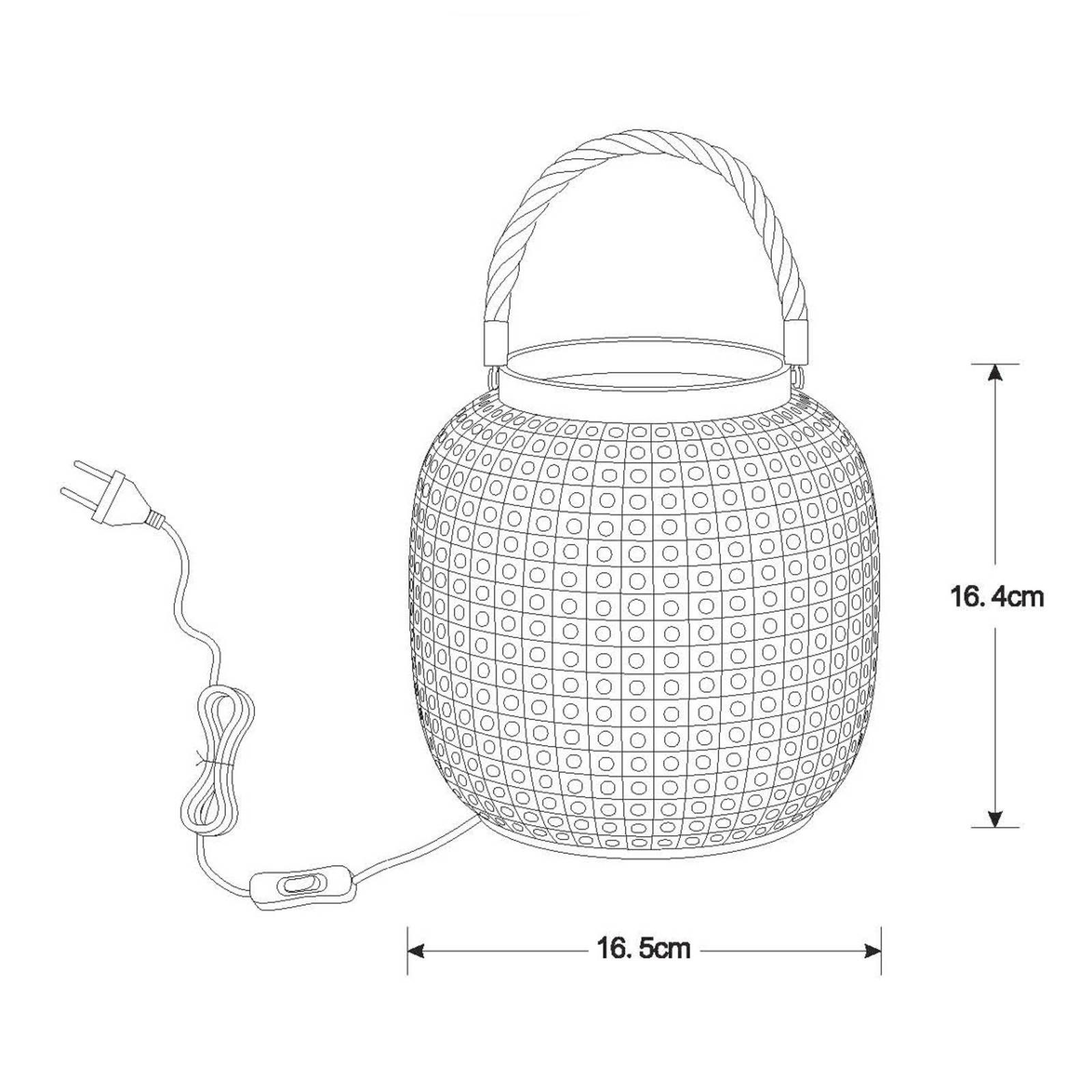 Lampada da tavolo Safiya in porcellana La lampada da tavolo Safiya ricorda la forma di un vaso di vimini che può essere trasportato da una corda fissata al suo bordo superiore. Il colore è realizzato in ceramica e intervallato da un regolare schema di fori. In questo modo la luce può in parte sfuggire lateralmente come un disegno a punti e viene anche emessa senza ostacoli attraverso l'apertura superiore. Safiya è particolarmente adatta come fonte di luce aggiuntiva e visivamente accattivante per il soggiorno. L'interruttore on/off si trova sul cavo con spina.